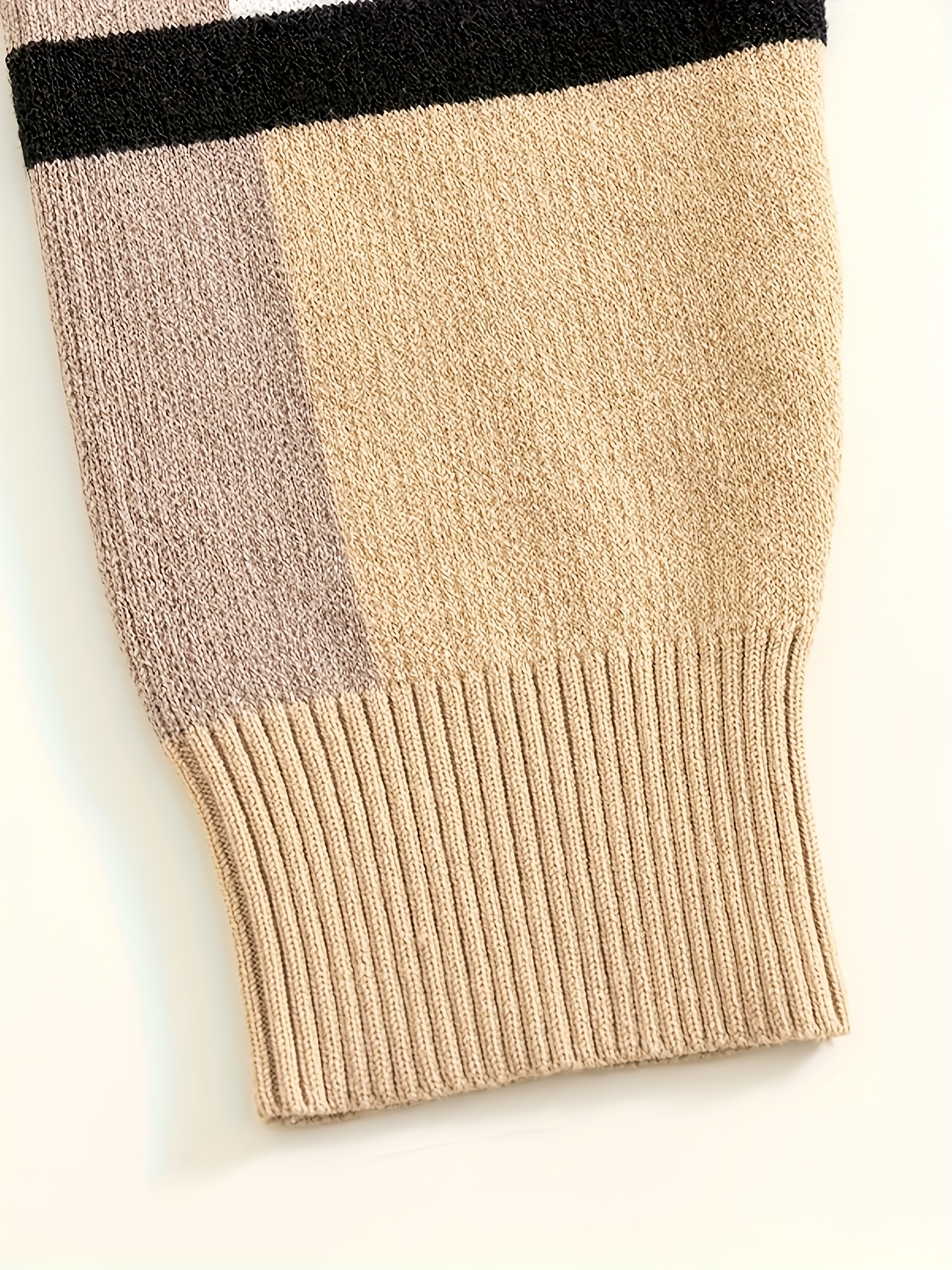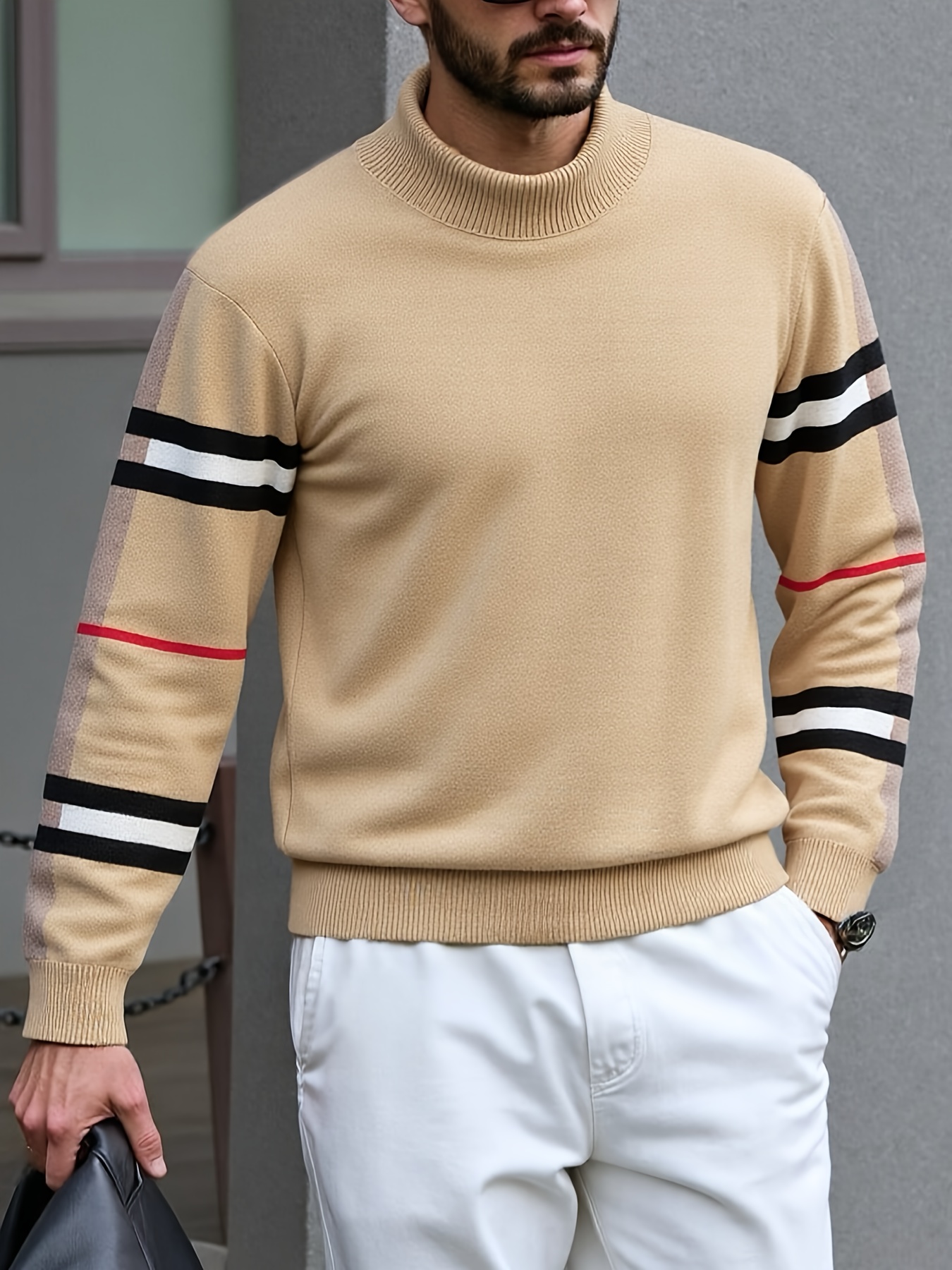 Men'S High-Neck Sweater with Striped Sleeves - Casual Knit Pullover for Fall & Winter, Beige & Black, Skinny Fit, Comfortable Clothing | Casual Style | Knit Construction, Sweater Hoodie