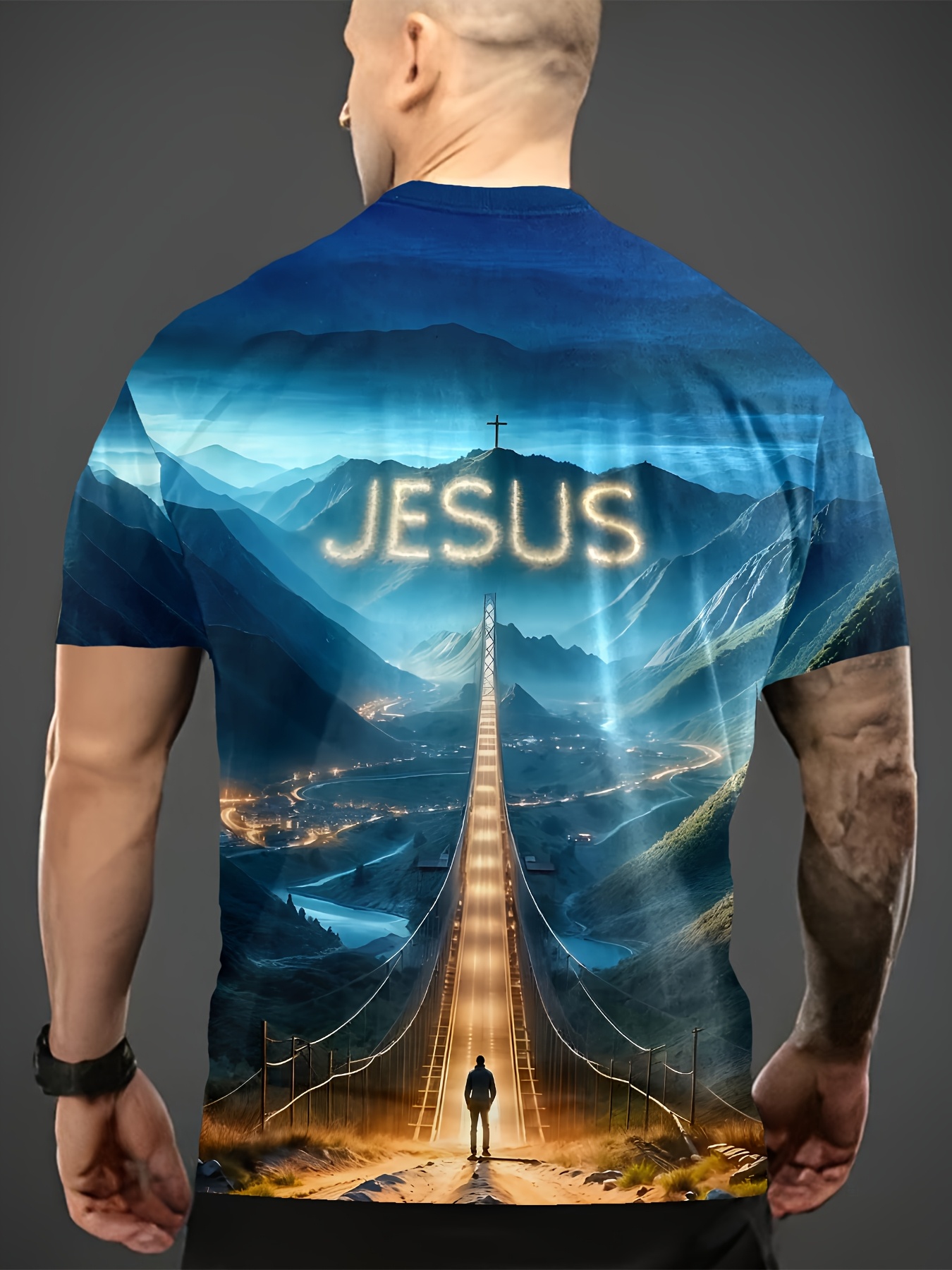 Men'S 3D Jesus Print T-Shirt - Casual Crew Neck, Short Sleeve, Stretch Fabric, Vibrant Mountain Landscape Design with Illuminated Pathway, Perfect for Spring & Summer