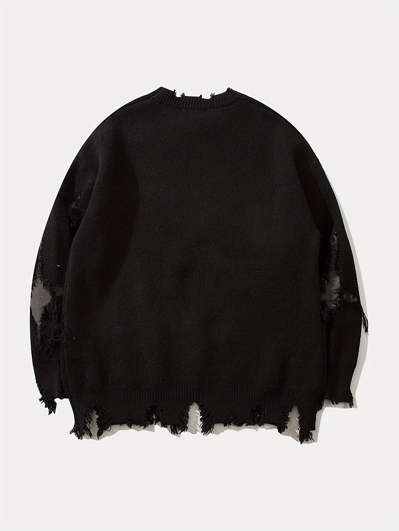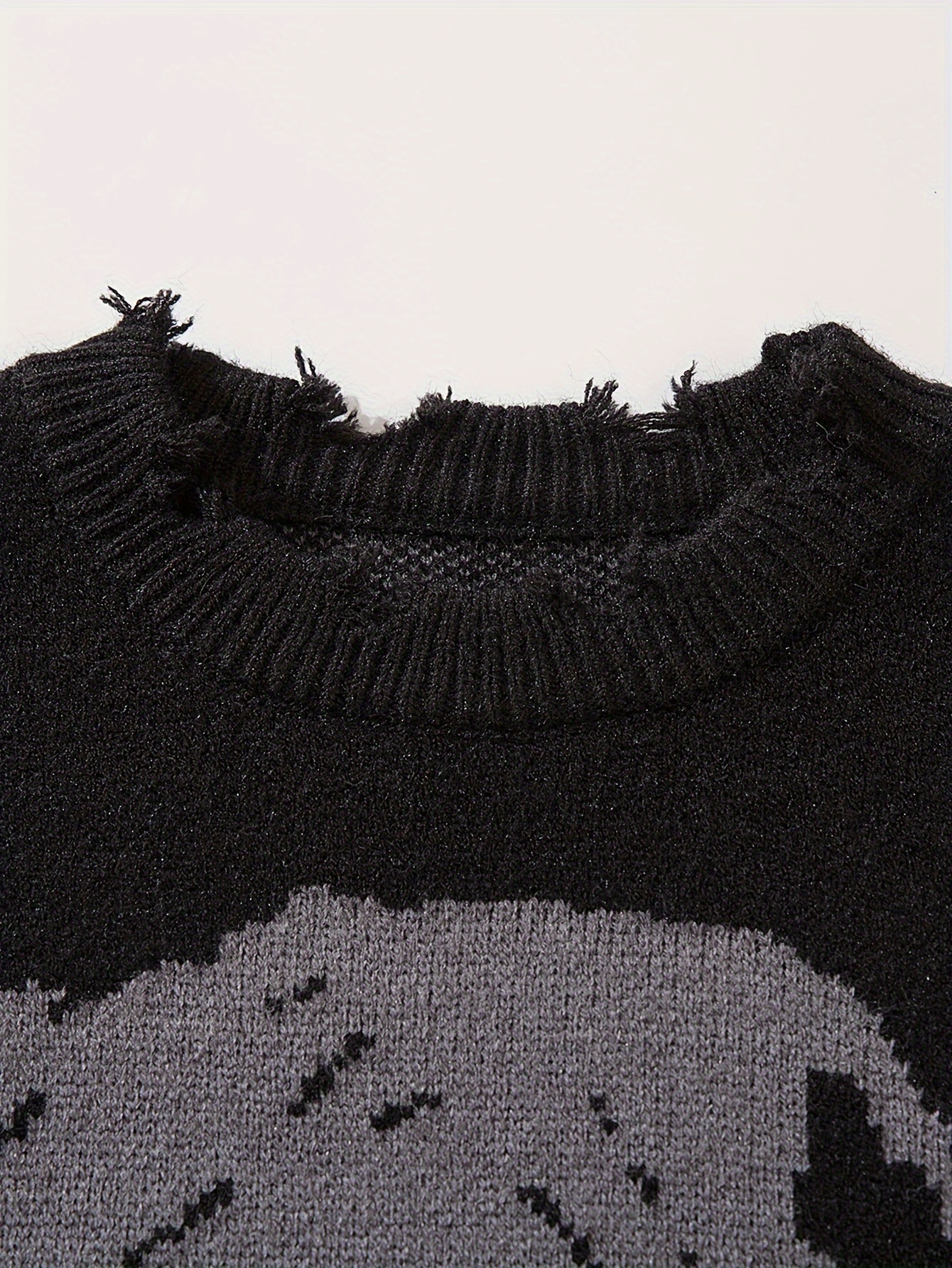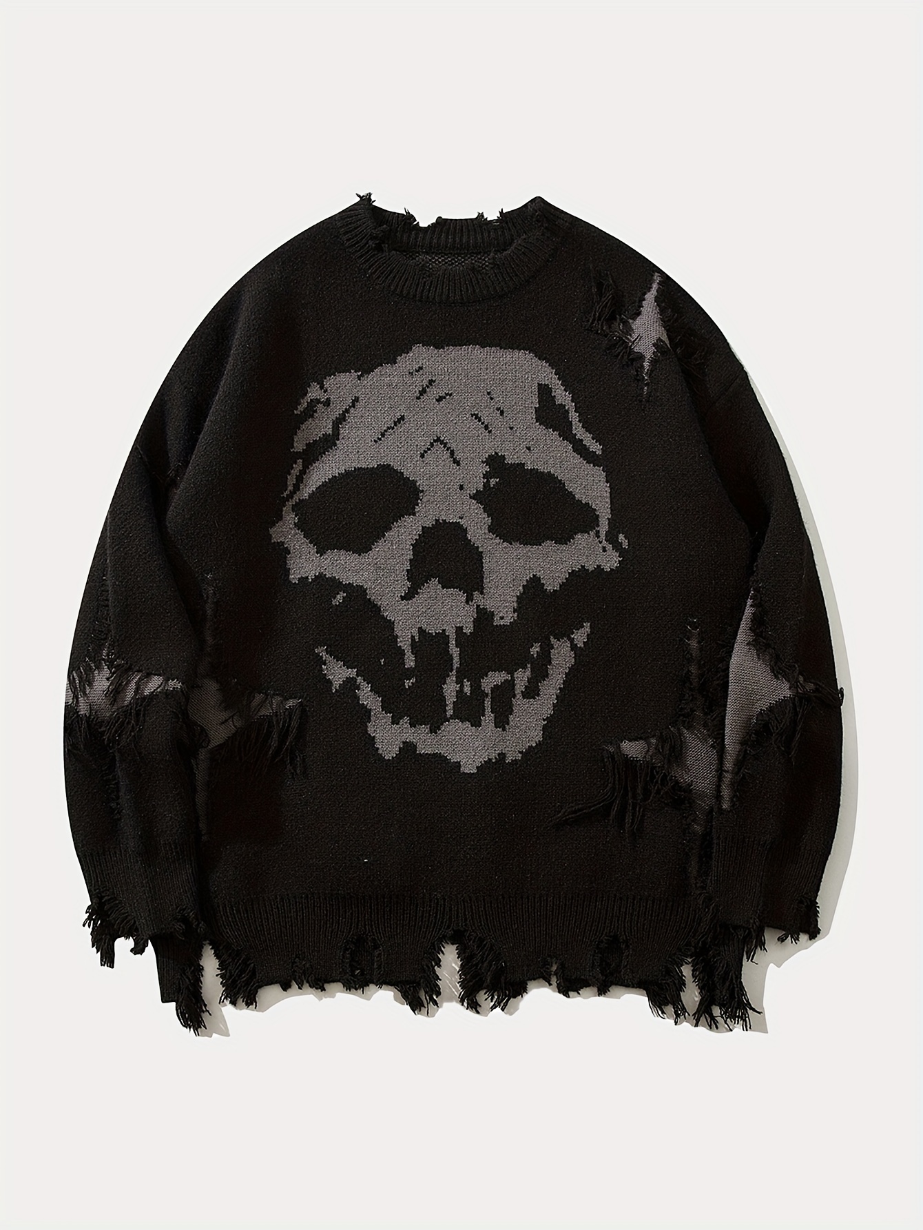 ANDREILEE Unisex Skull Print Crew Neck Sweater, Street Style Acrylic Blend, Loose Fit, Long Sleeve, Ripped Tassel Detail, Knit Pullovers for Fall/Winter