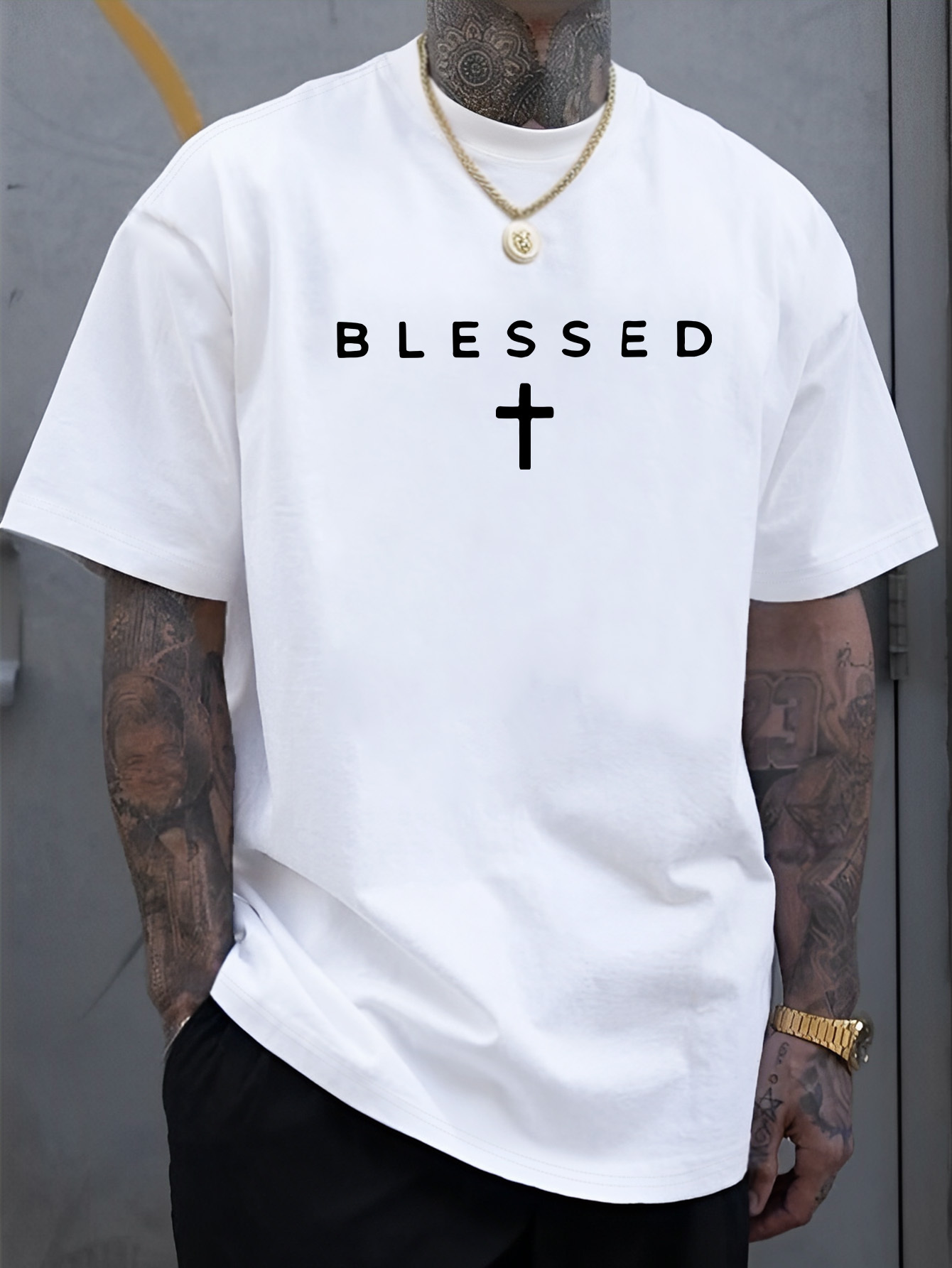 Men'S "Blessed" Cross Print T-Shirt - Casual Crew Neck, Short Sleeve, Lightweight Polyester, Summer Essential for Casual Attire, Everyday Tshirt | Trendy Casualwear | Comfortable Fit