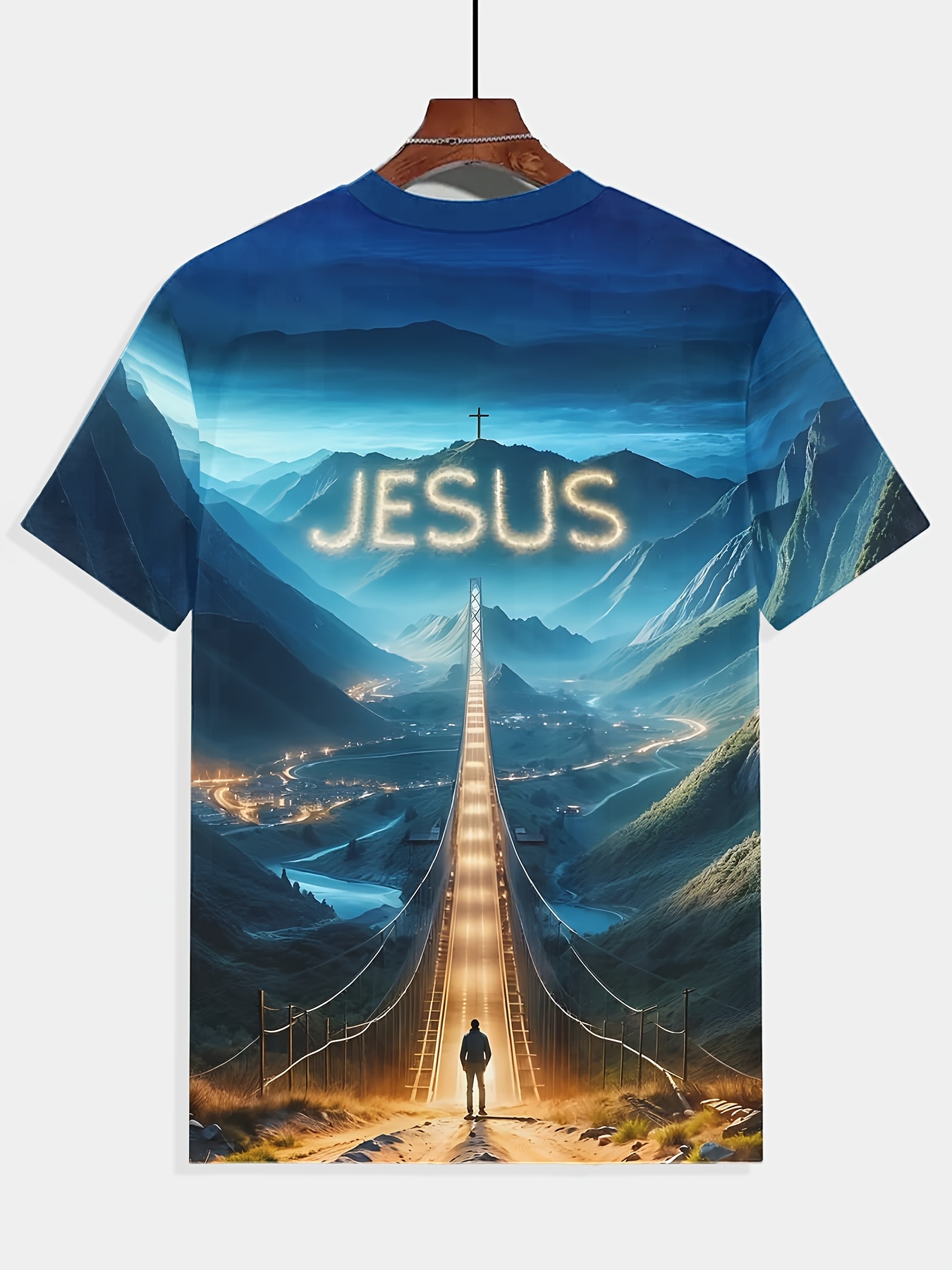 Men'S 3D Jesus Print T-Shirt - Casual Crew Neck, Short Sleeve, Stretch Fabric, Vibrant Mountain Landscape Design with Illuminated Pathway, Perfect for Spring & Summer