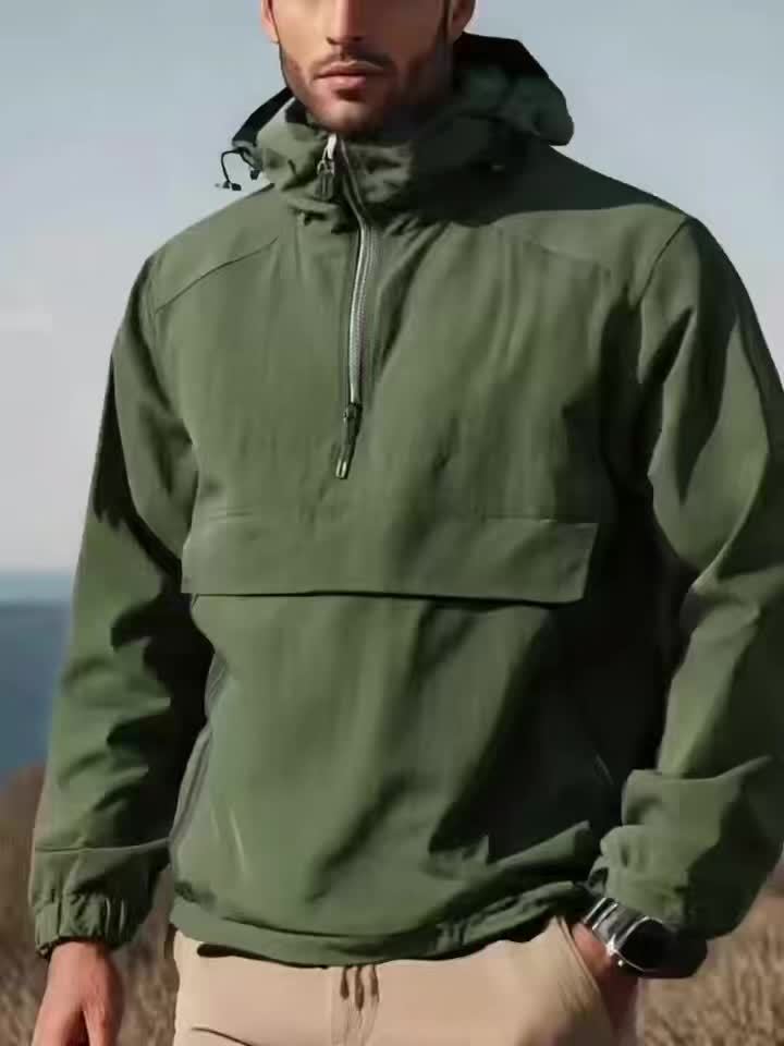 Men's Windproof Hooded Jacket - Casual Outdoor Pullover with Zipper Pockets, Long Sleeve, Machine Washable, Green Polyester Fabric for Spring/Fall, Windbreaker Jacket