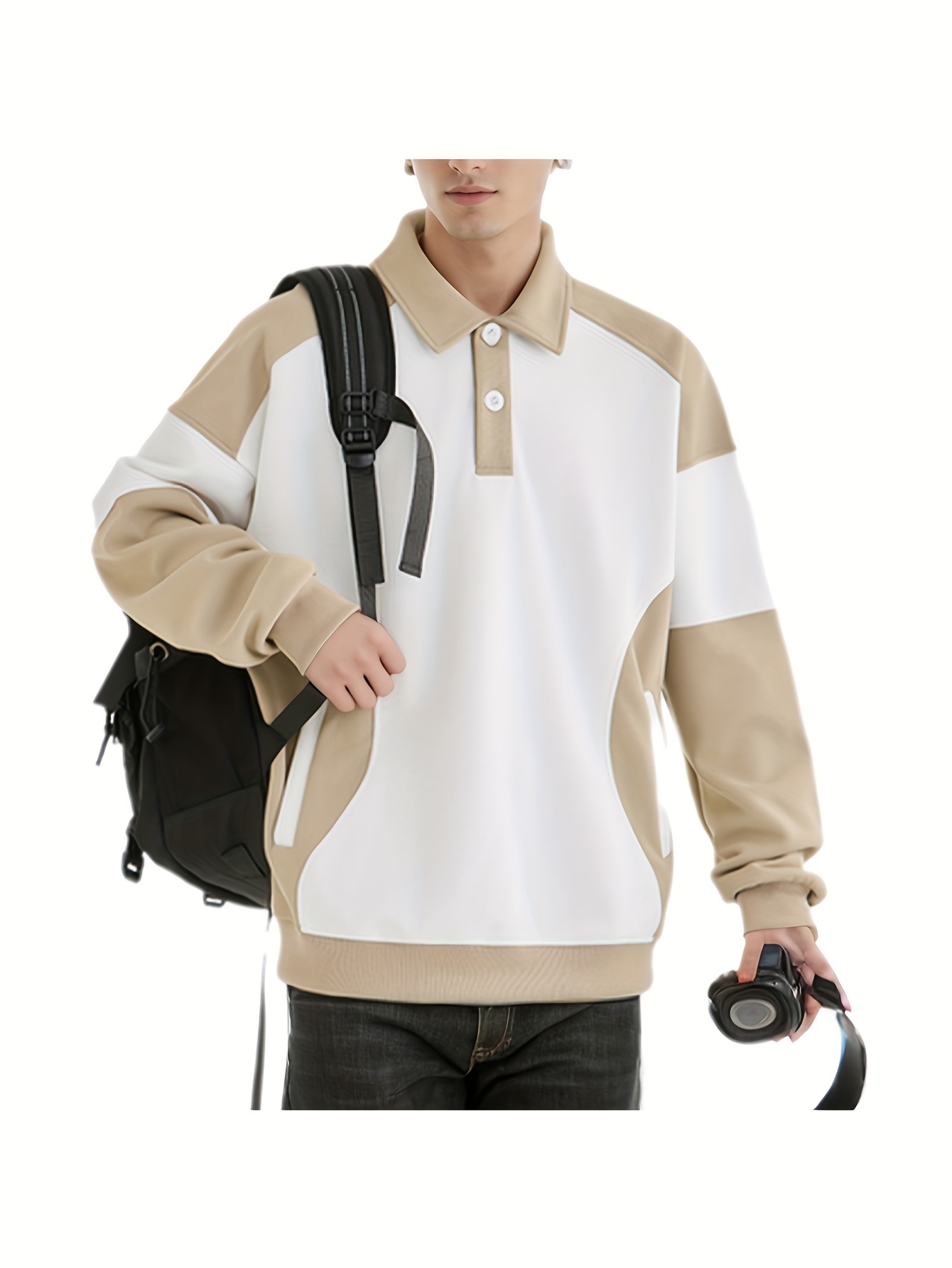 [NASAOVER Long Sleeve Shirt] Men's NASAOVER Colorblock Long Sleeve Shirt - Casual Loose Fit, Two-Tone Black/Beige, Button Detail, Ideal for Spring & Summer Outdoor Activities
